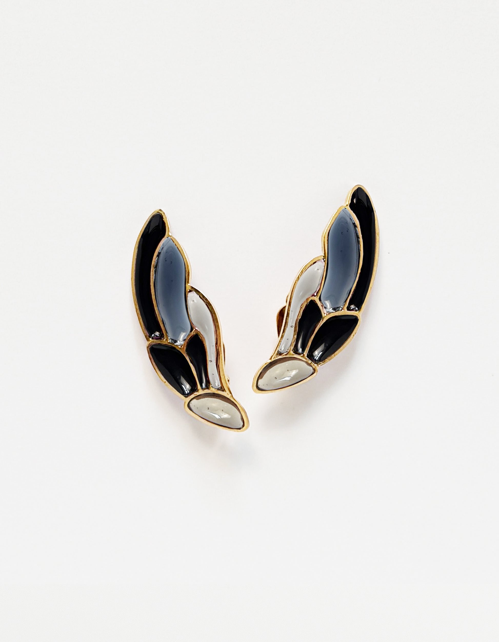 Ces boucles d'oreilles clips en forme d'ailes de Cigale sont en pâte de verre et plaqué or 24K. Elles sont fabriquées à la main à Paris. Signé Loulou de la Falaise.