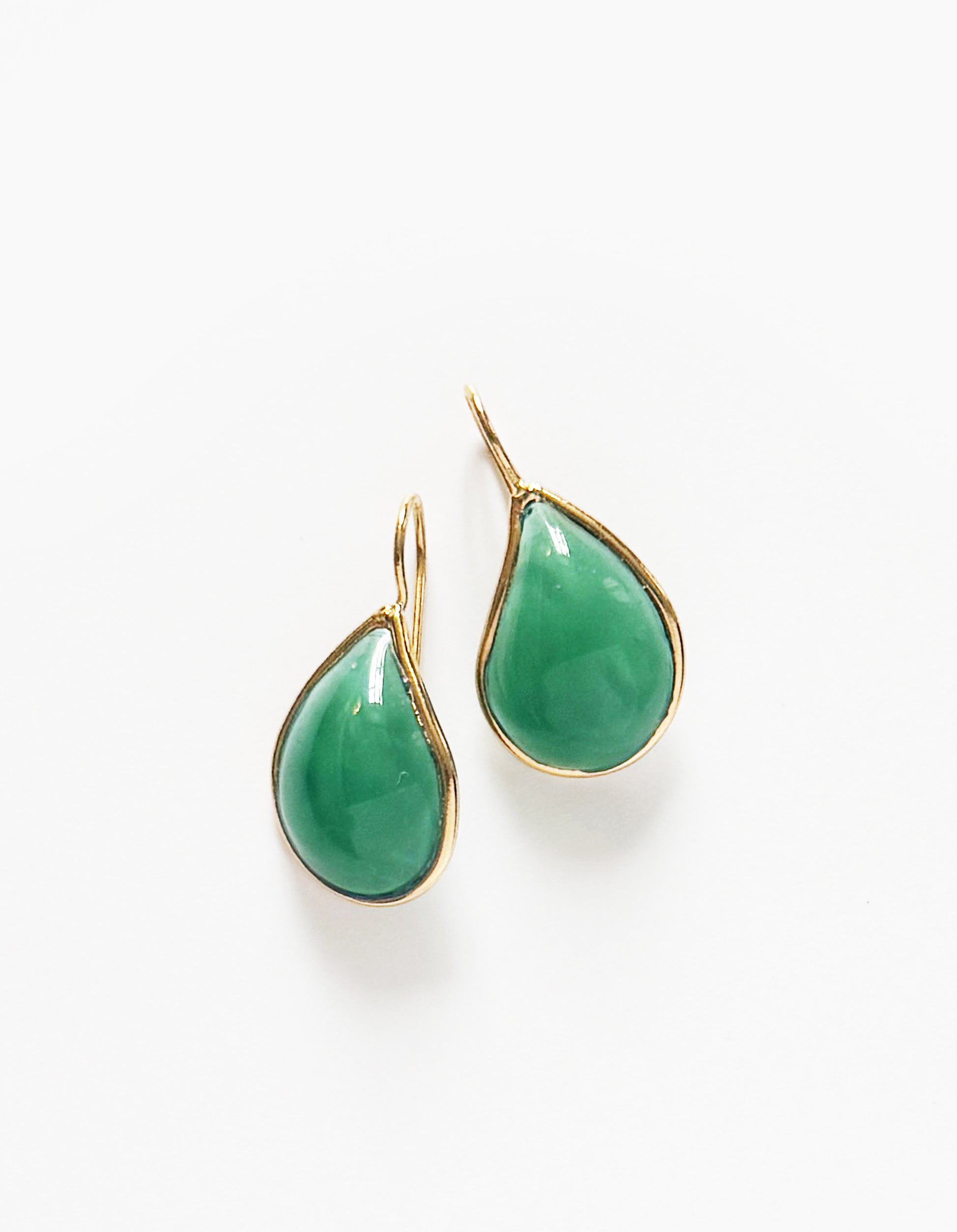 Ces boucles d’oreilles de couleur Émeraude ont la forme de Larmes. En plaqué or 24K et pâte de verre, elles sont faites à la main à Paris.
