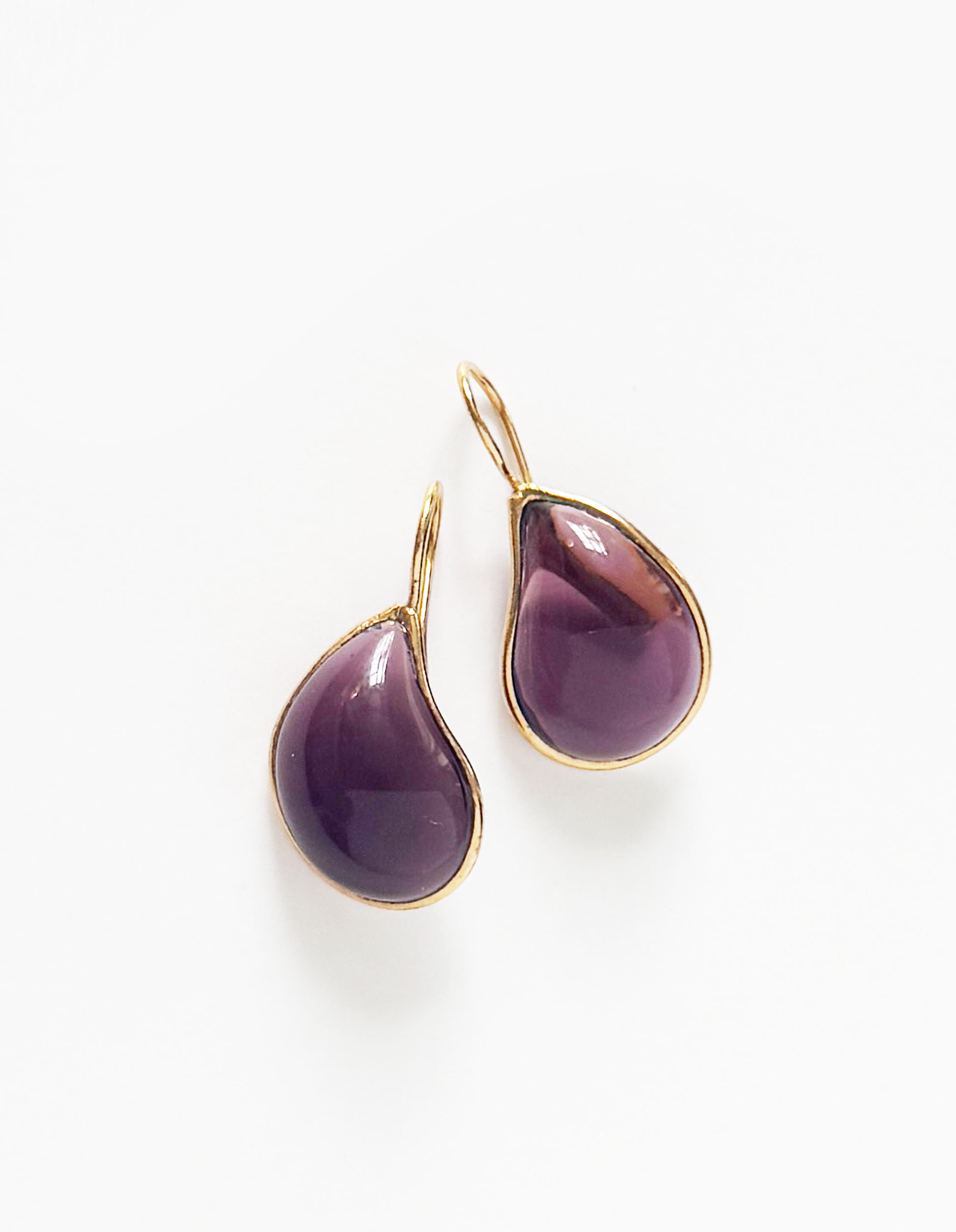 Ces boucles d’oreilles de couleur Bruyère ont la forme de Larmes. En plaqué or 24K et pâte de verre, elles sont faites à la main à Paris.