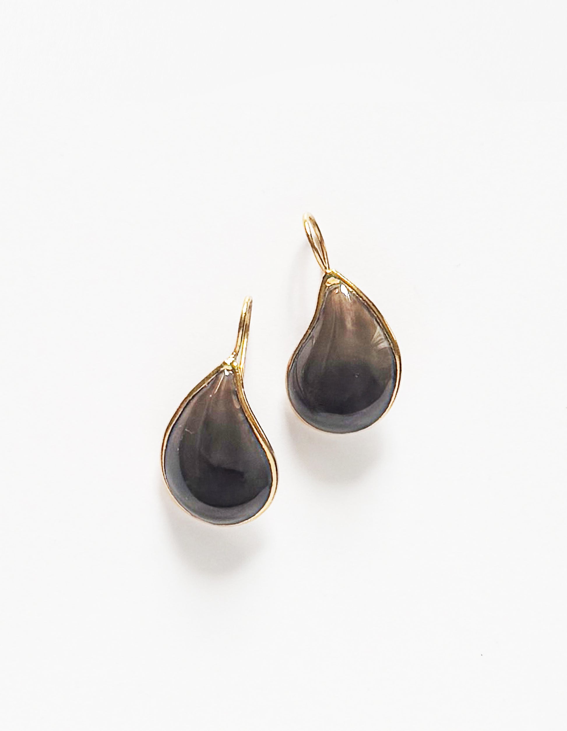 Ces boucles d’oreilles de couleur Cendre ont la forme de Larmes. En plaqué or 24K et pâte de verre, elles sont faites à la main à Paris.