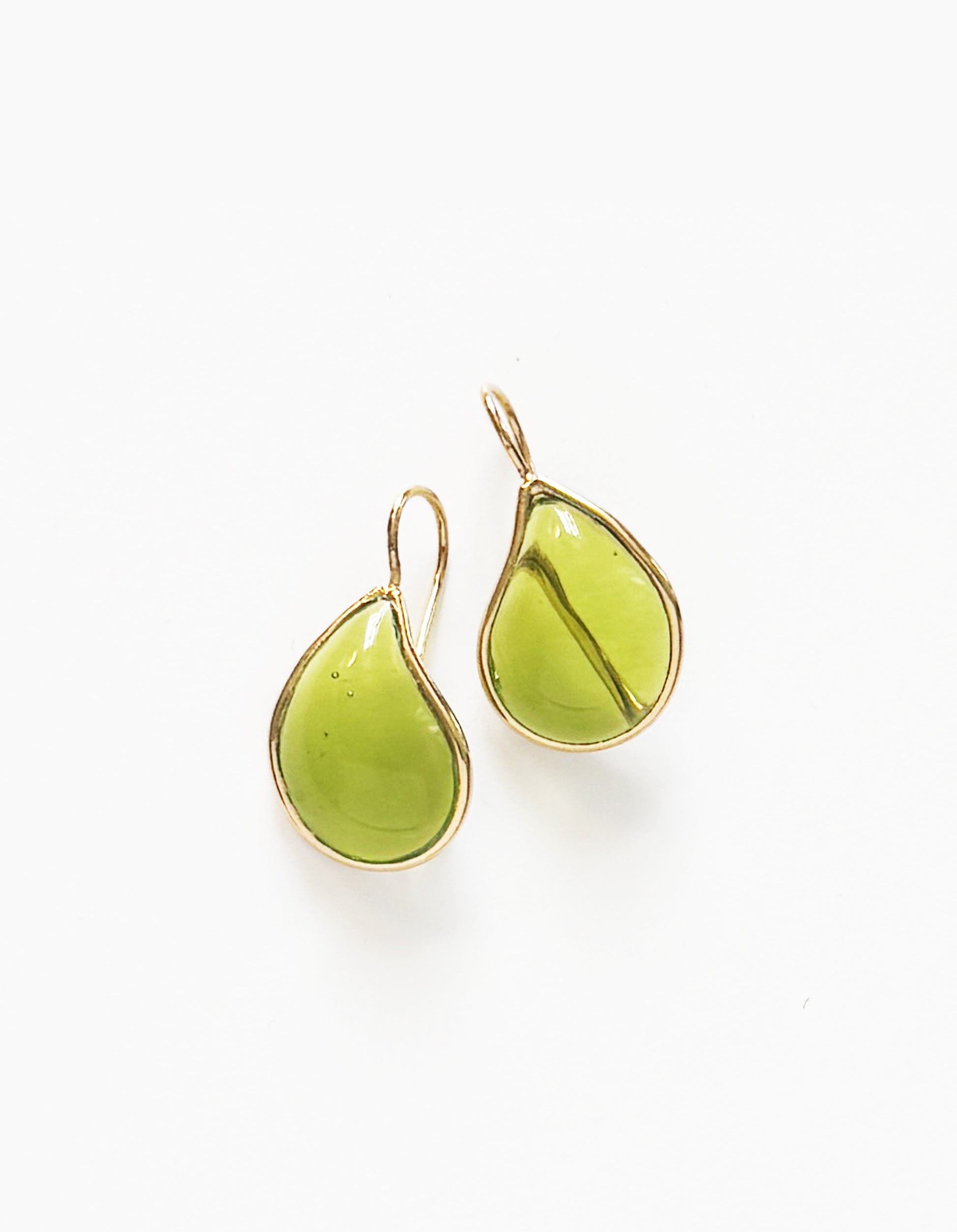 Ces boucles d’oreilles de couleur Chartreuse ont la forme de Larmes. En plaqué or 24K et pâte de verre, elles sont faites à la main à Paris.