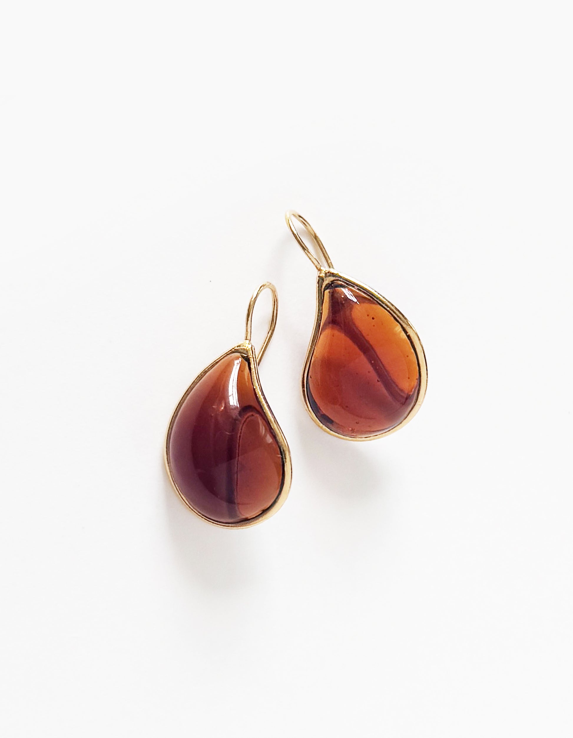 Ces boucles d’oreilles de couleur Cognac ont la forme de Larmes. En plaqué or 24K et pâte de verre, elles sont faites à la main à Paris.
