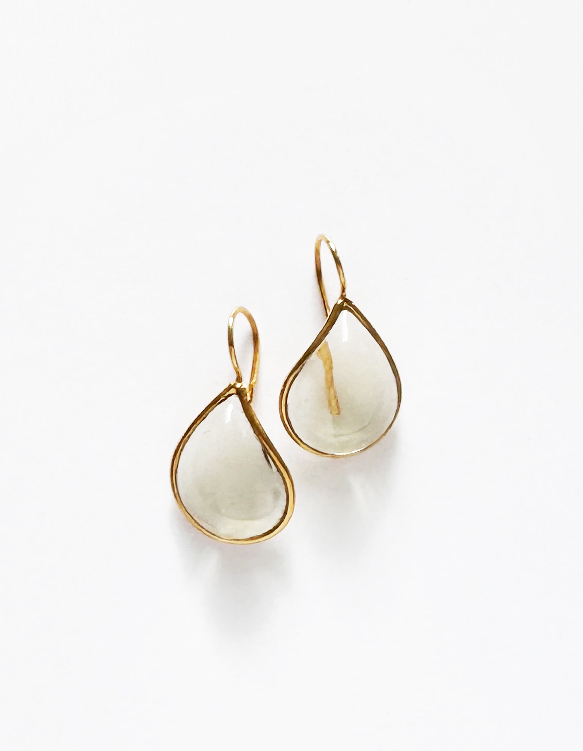 Ces boucles d’oreilles de couleur Champagne ont la forme de Larmes. En plaqué or 24K et pâte de verre, elles sont faites à la main à Paris.