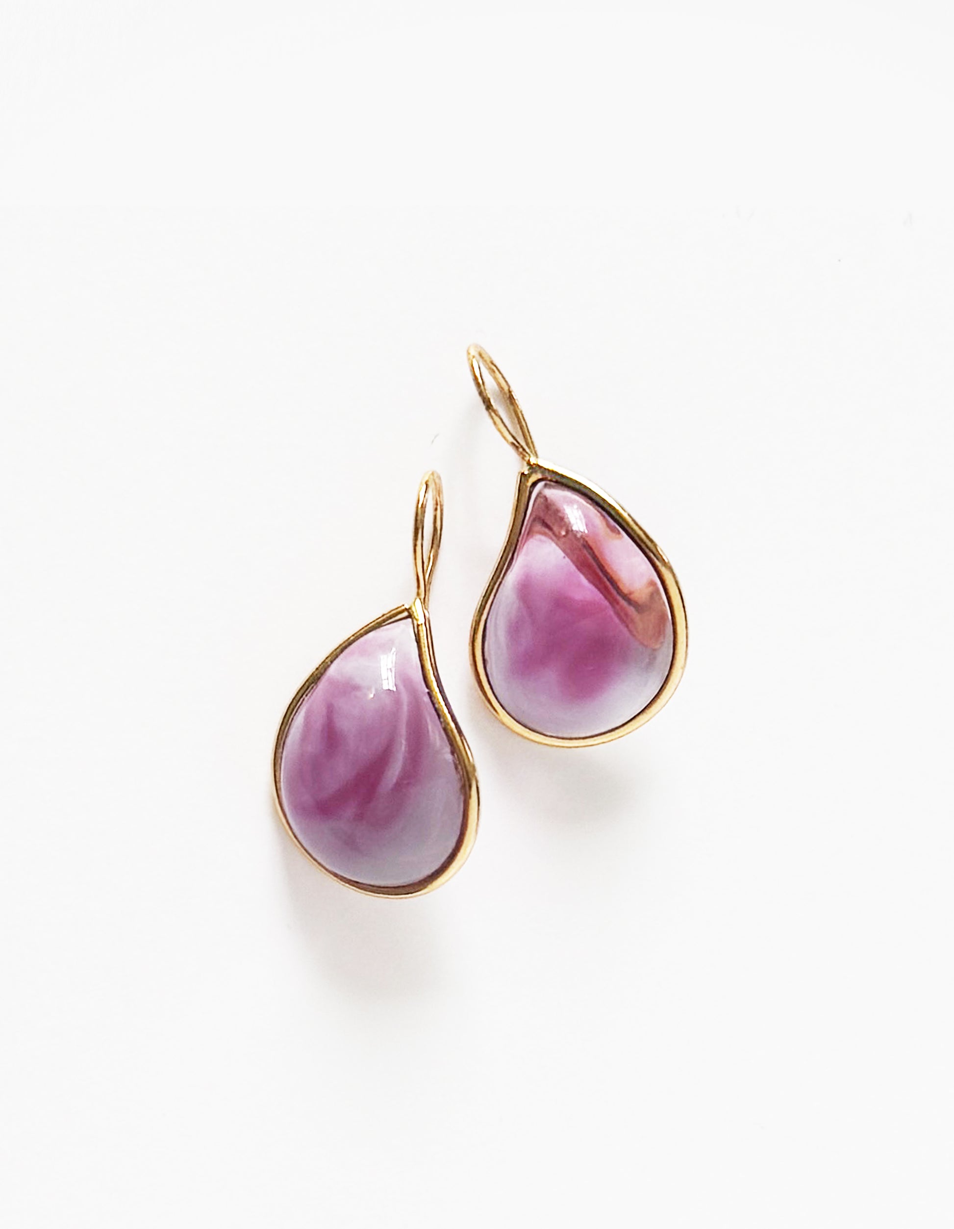 Ces boucles d’oreilles de couleur Cyclamen ont la forme de Larmes. En plaqué or 24K et pâte de verre, elles sont faites à la main à Paris.