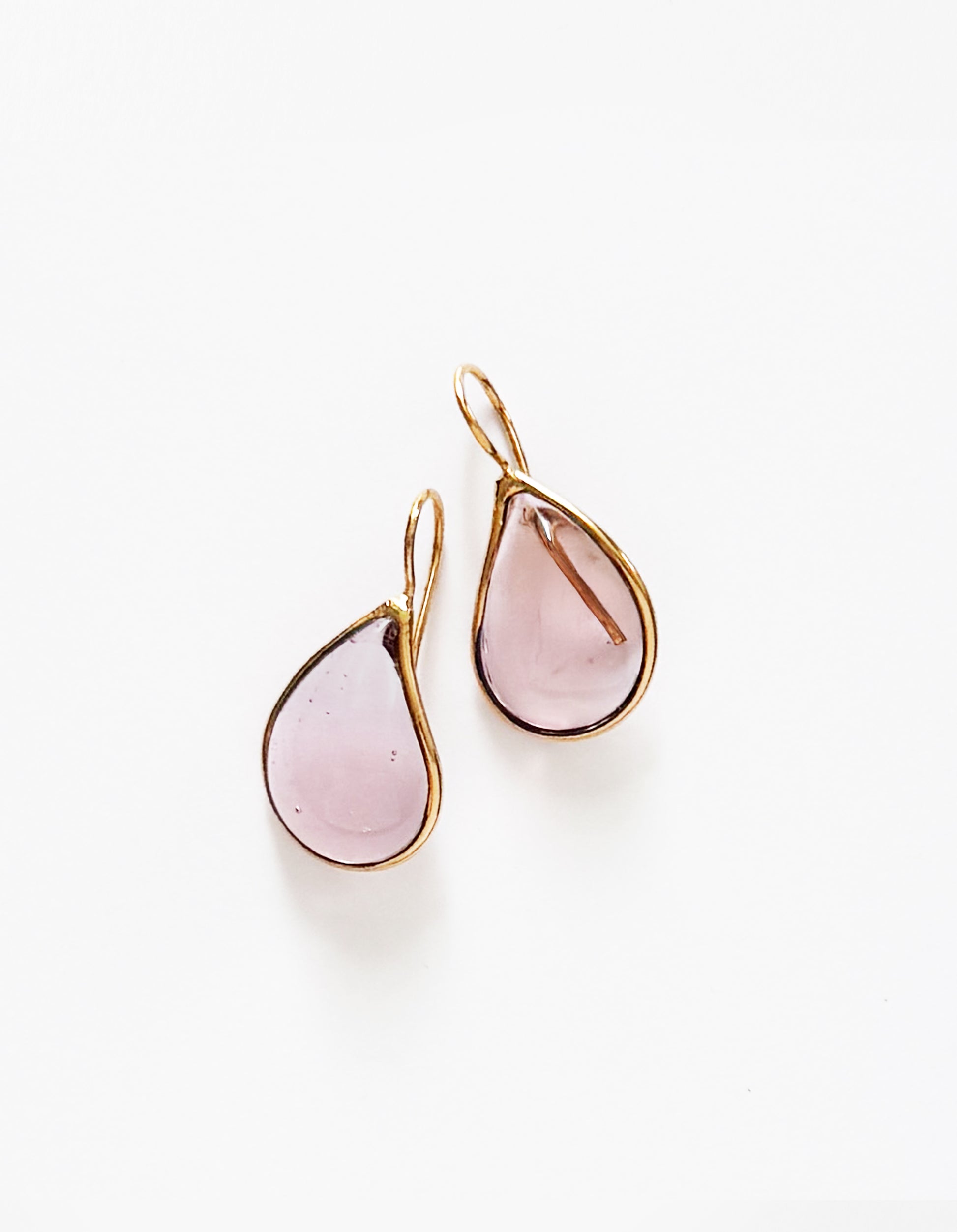 Ces boucles d’oreilles de couleur Dragée ont la forme de Larmes. En plaqué or 24K et pâte de verre, elles sont faites à la main à Paris.
