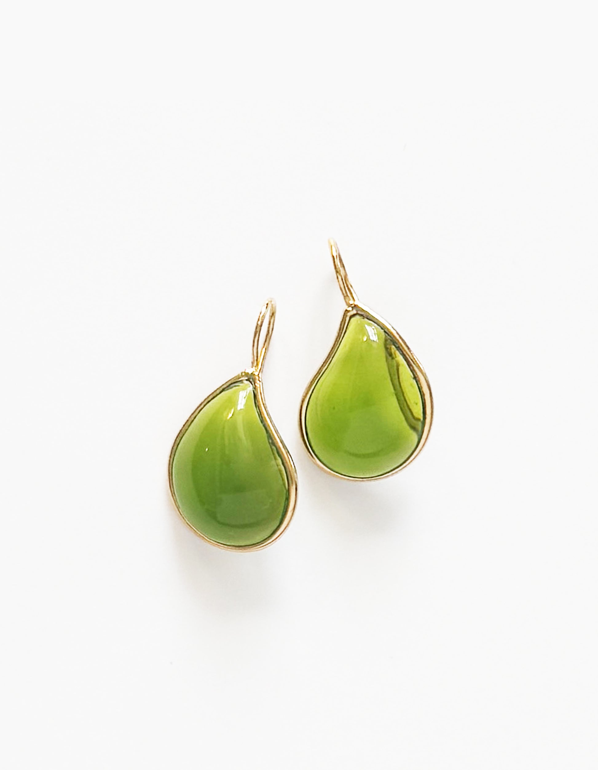 Ces boucles d’oreilles de couleur Fougère ont la forme de Larmes. En plaqué or 24K et pâte de verre, elles sont faites à la main à Paris.