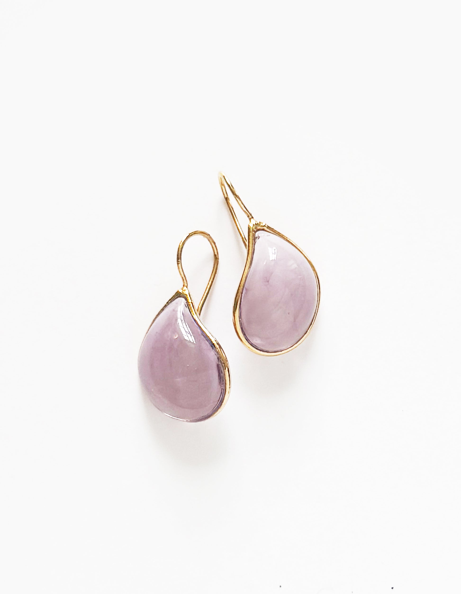 Ces boucles d’oreilles de couleur Lierre ont la forme de Larmes. En plaqué or 24K et pâte de verre, elles sont faites à la main à Paris.