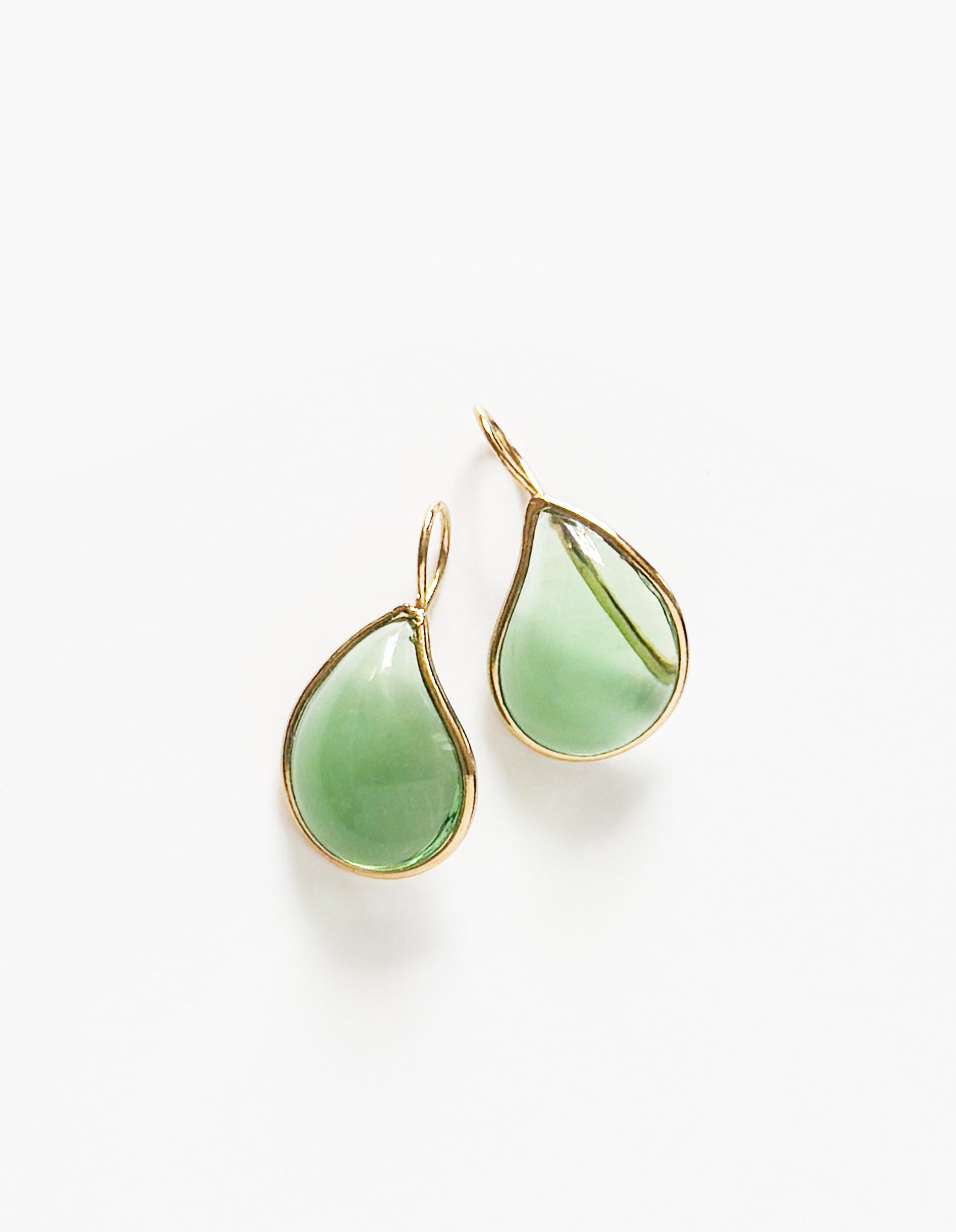 Ces boucles d’oreilles de couleur Jade ont la forme de Larmes. En plaqué or 24K et pâte de verre, elles sont faites à la main à Paris.