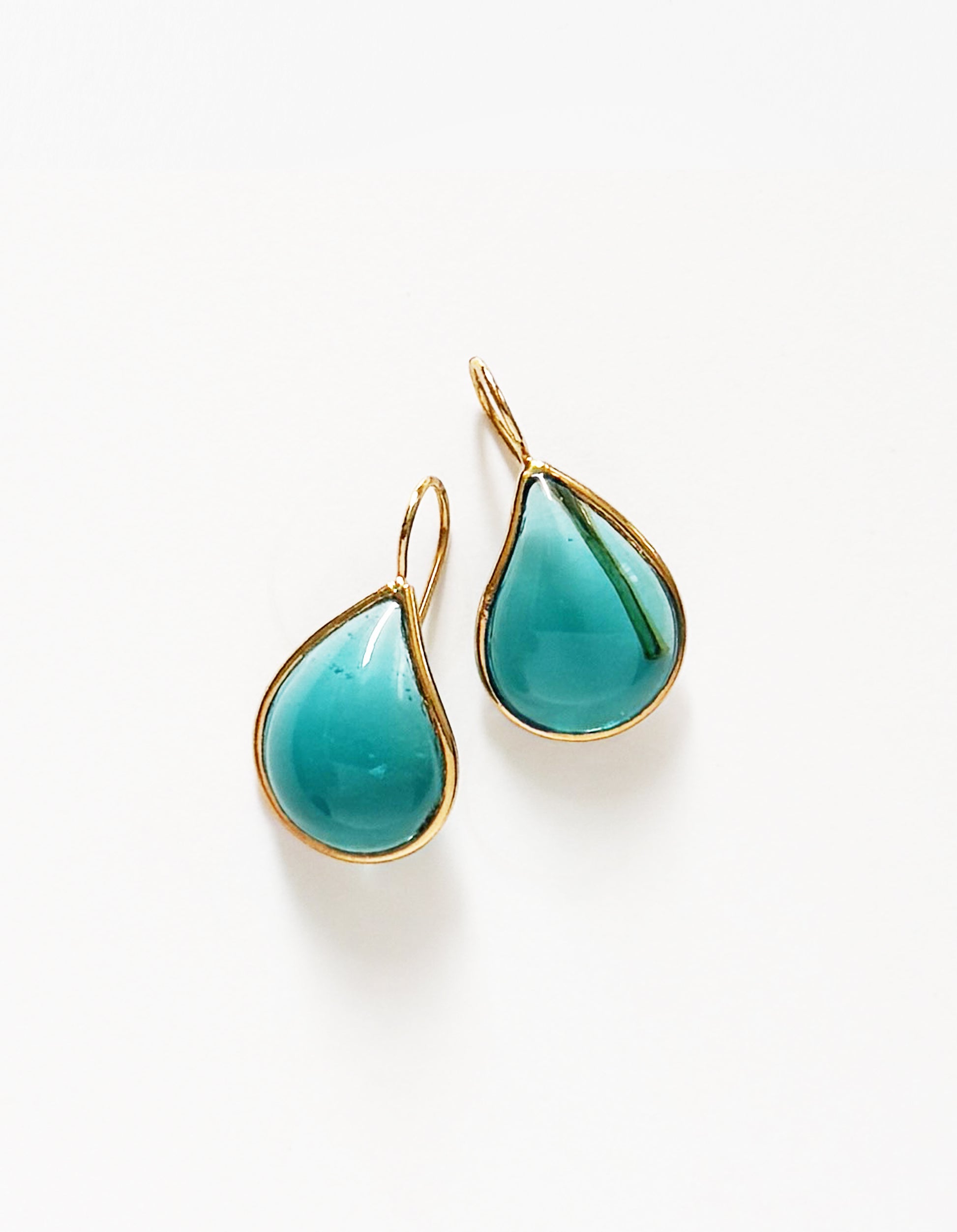 Ces boucles d’oreilles de couleur Lagon ont la forme de Larmes. En plaqué or 24K et pâte de verre, elles sont faites à la main à Paris.
