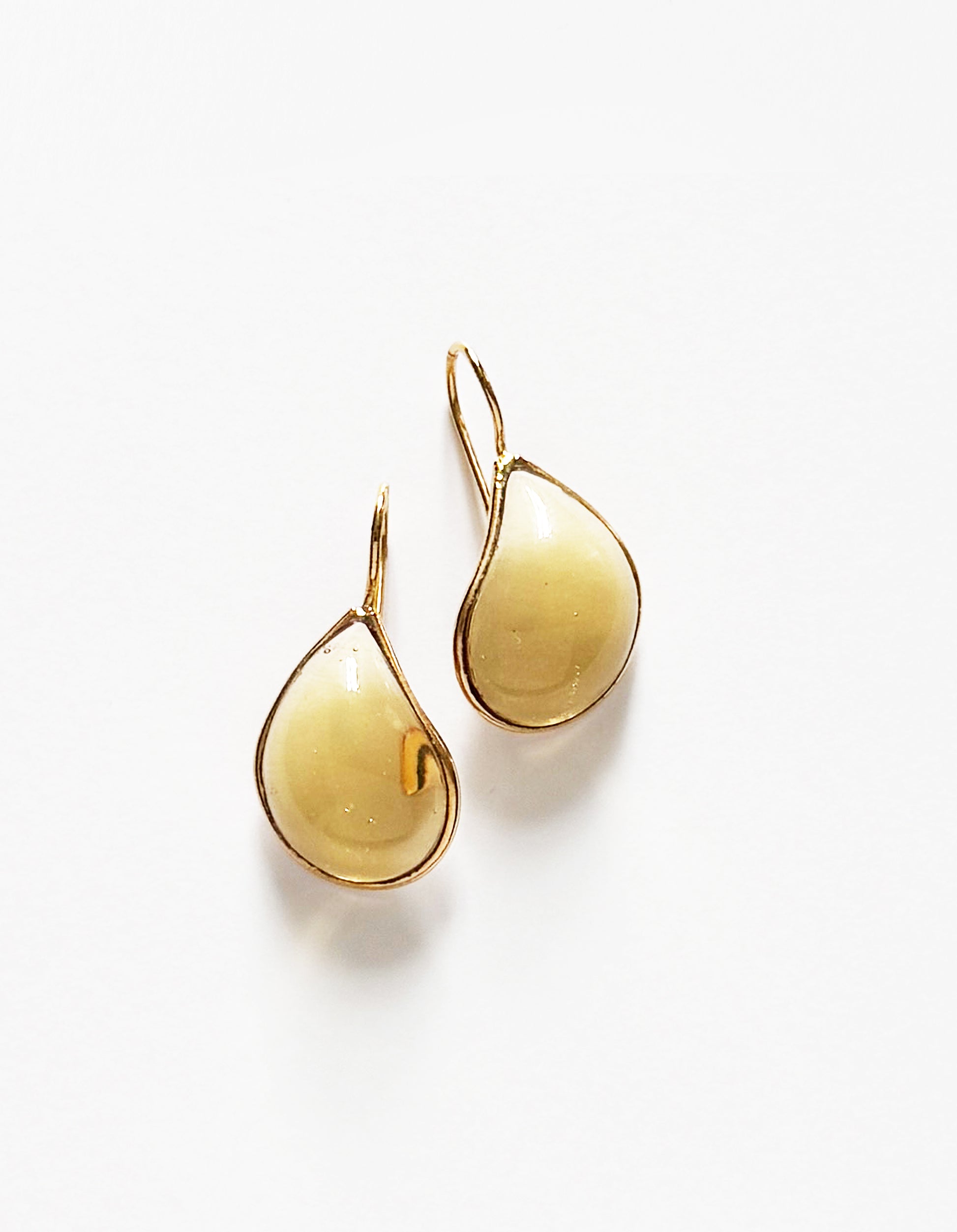 Ces boucles d’oreilles de couleur Champagne ont la forme de Larmes. En plaqué or 24K et pâte de verre, elles sont faites à la main à Paris.