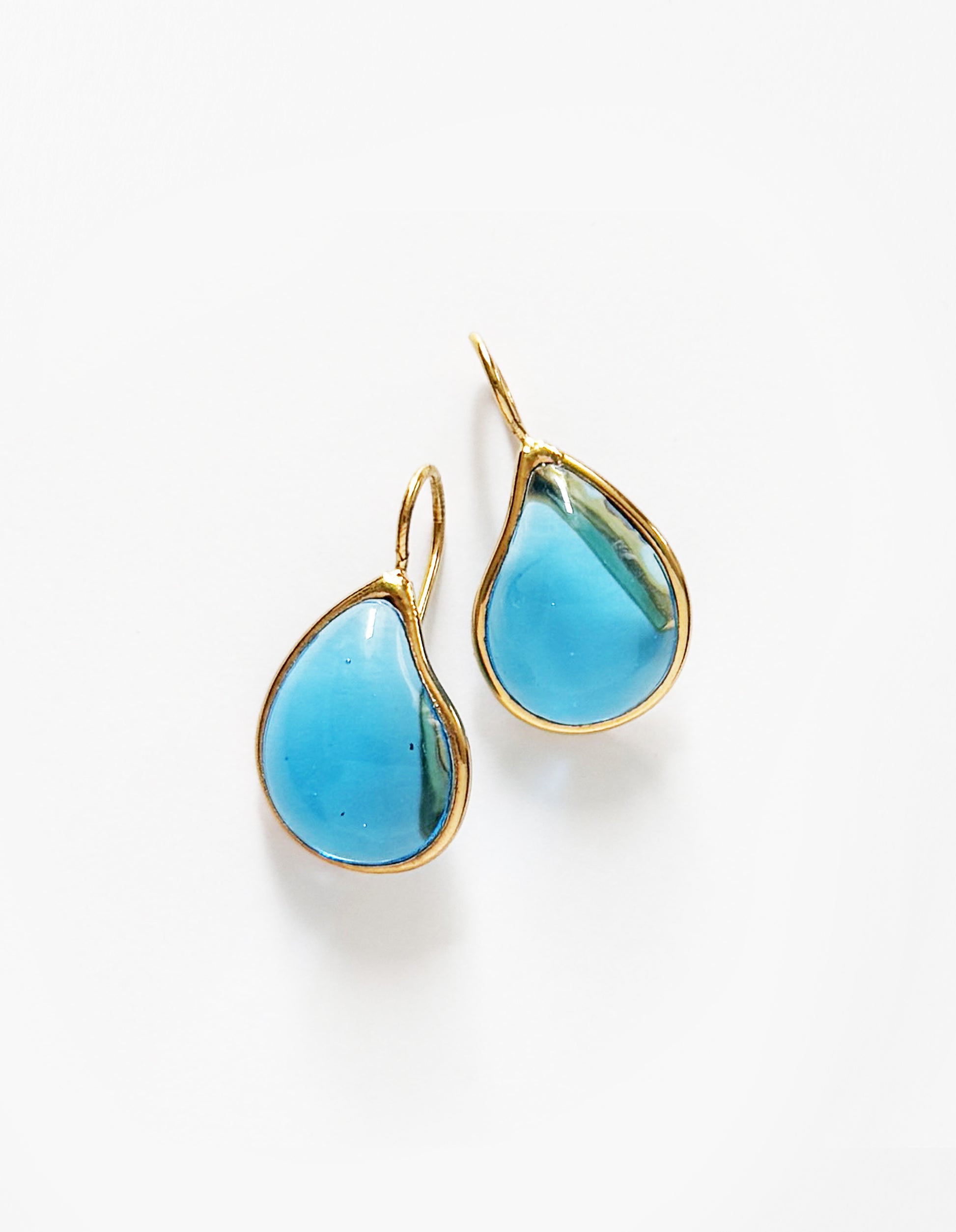 Ces boucles d’oreilles de couleur Nassau ont la forme de Larmes. En plaqué or 24K et pâte de verre, elles sont faites à la main à Paris.