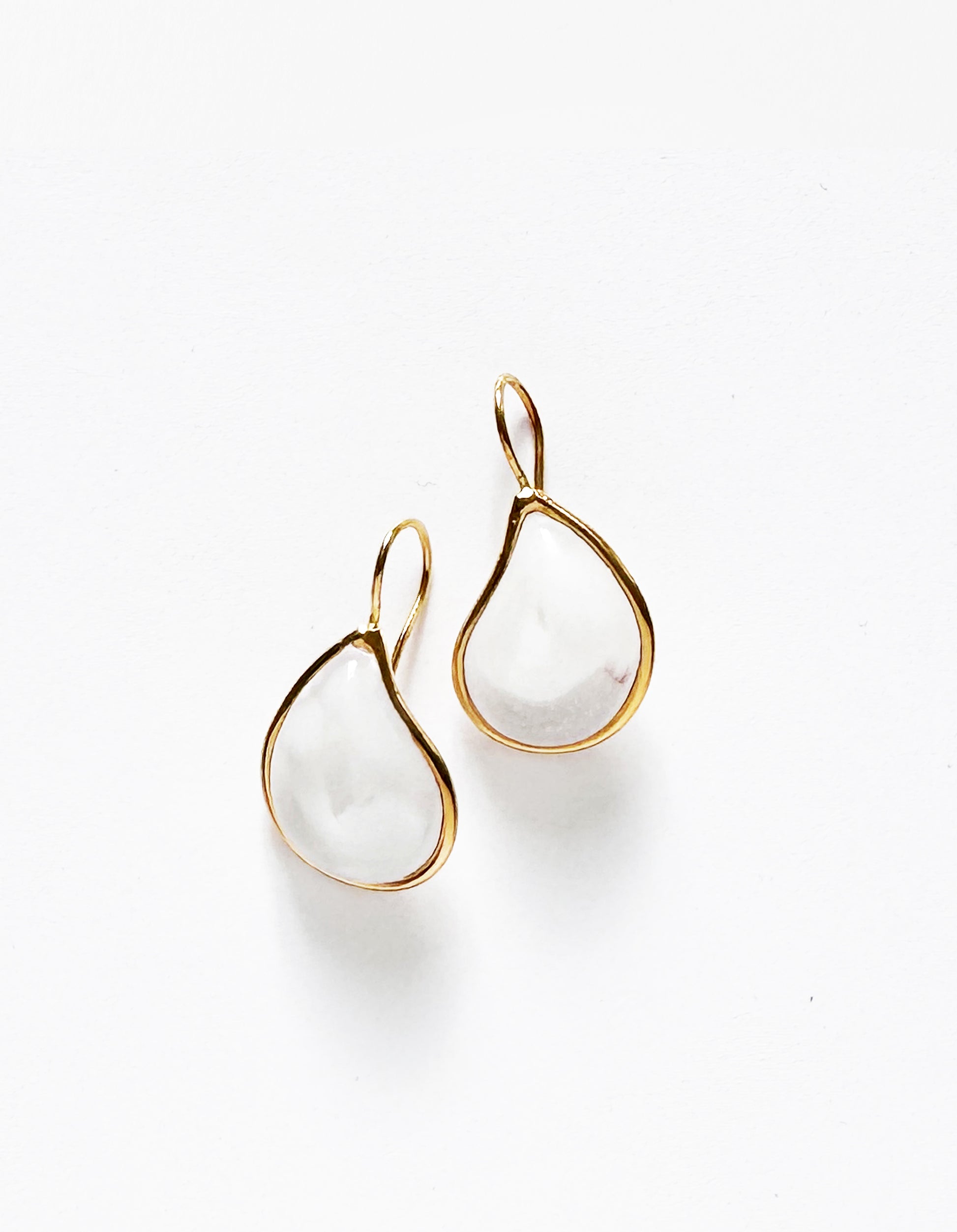 Ces boucles d’oreilles de couleur transparente ont la forme de Larmes. En plaqué or 24K et pâte de verre, elles sont faites à la main à Paris.