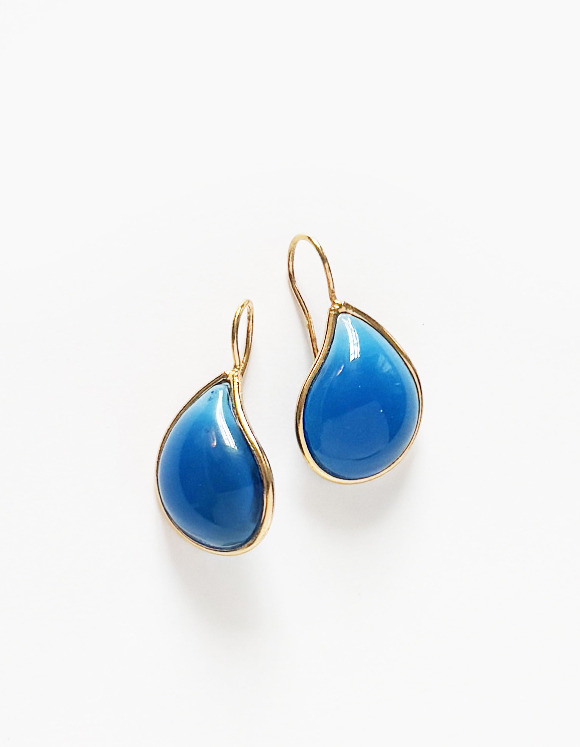 Ces boucles d’oreilles de couleur Océan ont la forme de Larmes. En plaqué or 24K et pâte de verre, elles sont faites à la main à Paris.