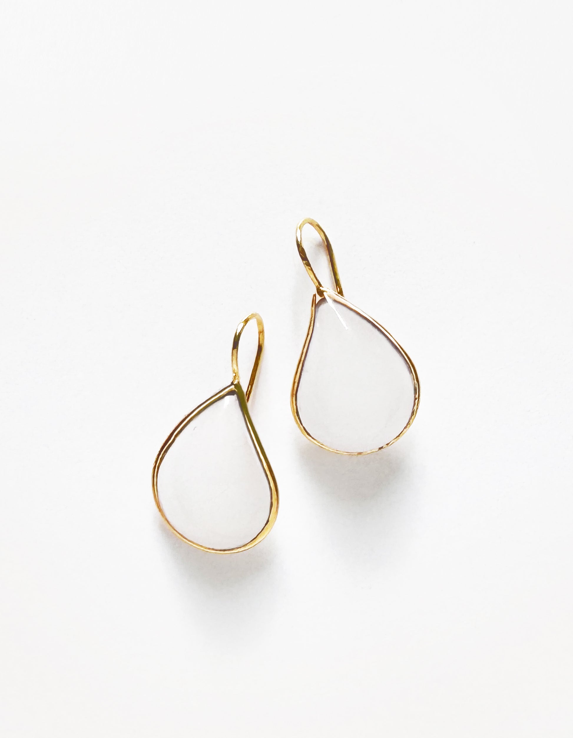 Ces boucles d’oreilles de couleur Opaline ont la forme de Larmes. En plaqué or 24K et pâte de verre, elles sont faites à la main à Paris.