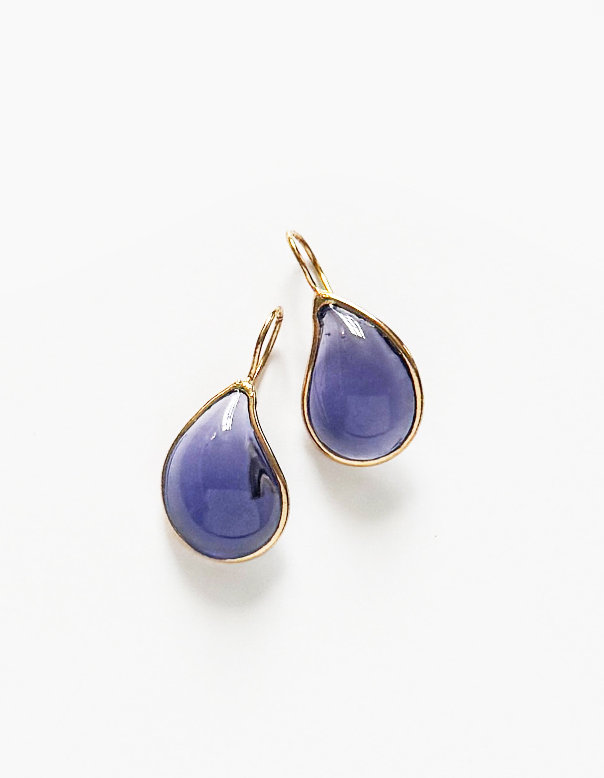 Ces boucles d’oreilles de couleur Orchidée ont la forme de Larmes. En plaqué or 24K et pâte de verre, elles sont faites à la main à Paris.