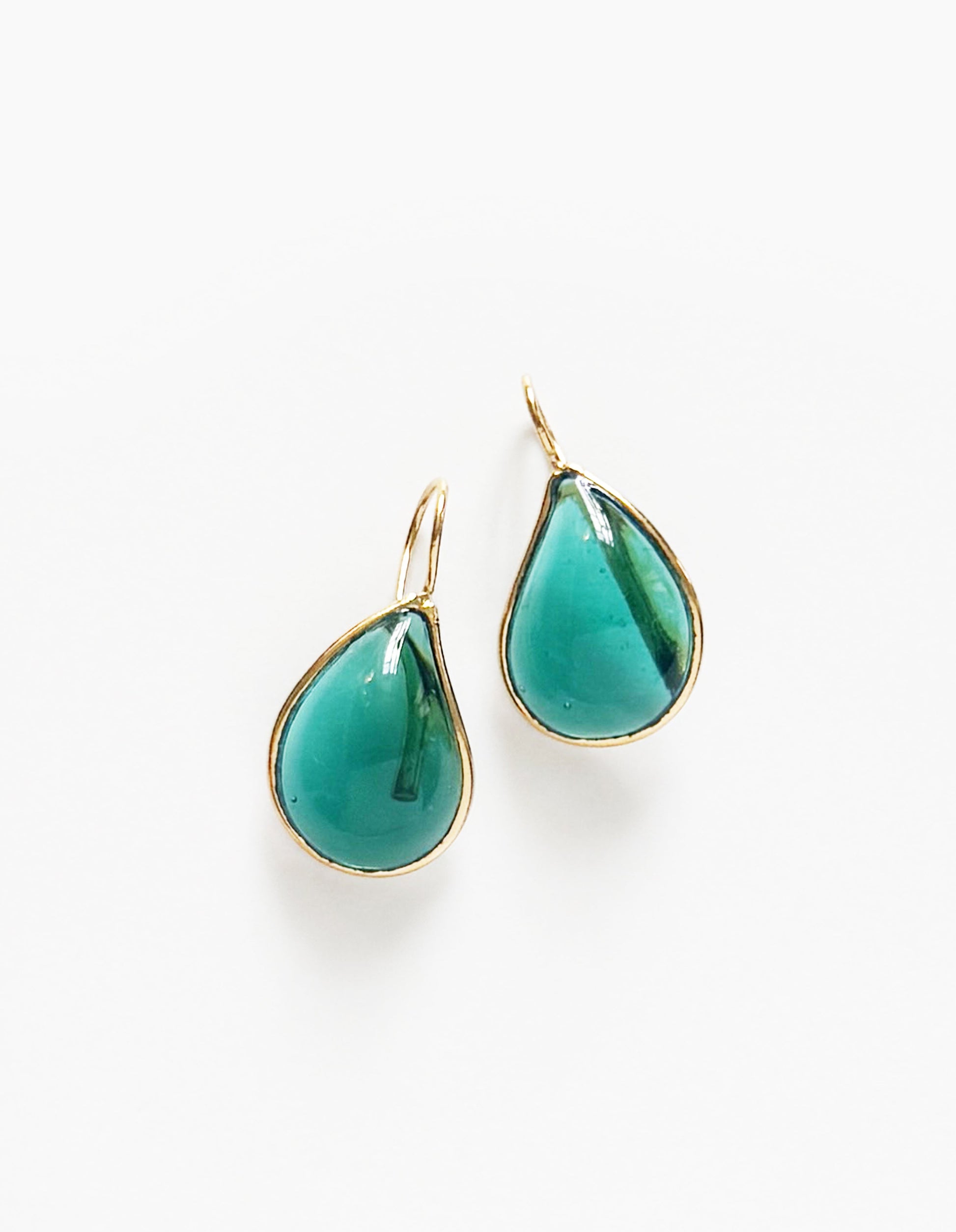 Ces boucles d’oreilles de couleur Paon ont la forme de Larmes. En plaqué or 24K et pâte de verre, elles sont faites à la main à Paris.