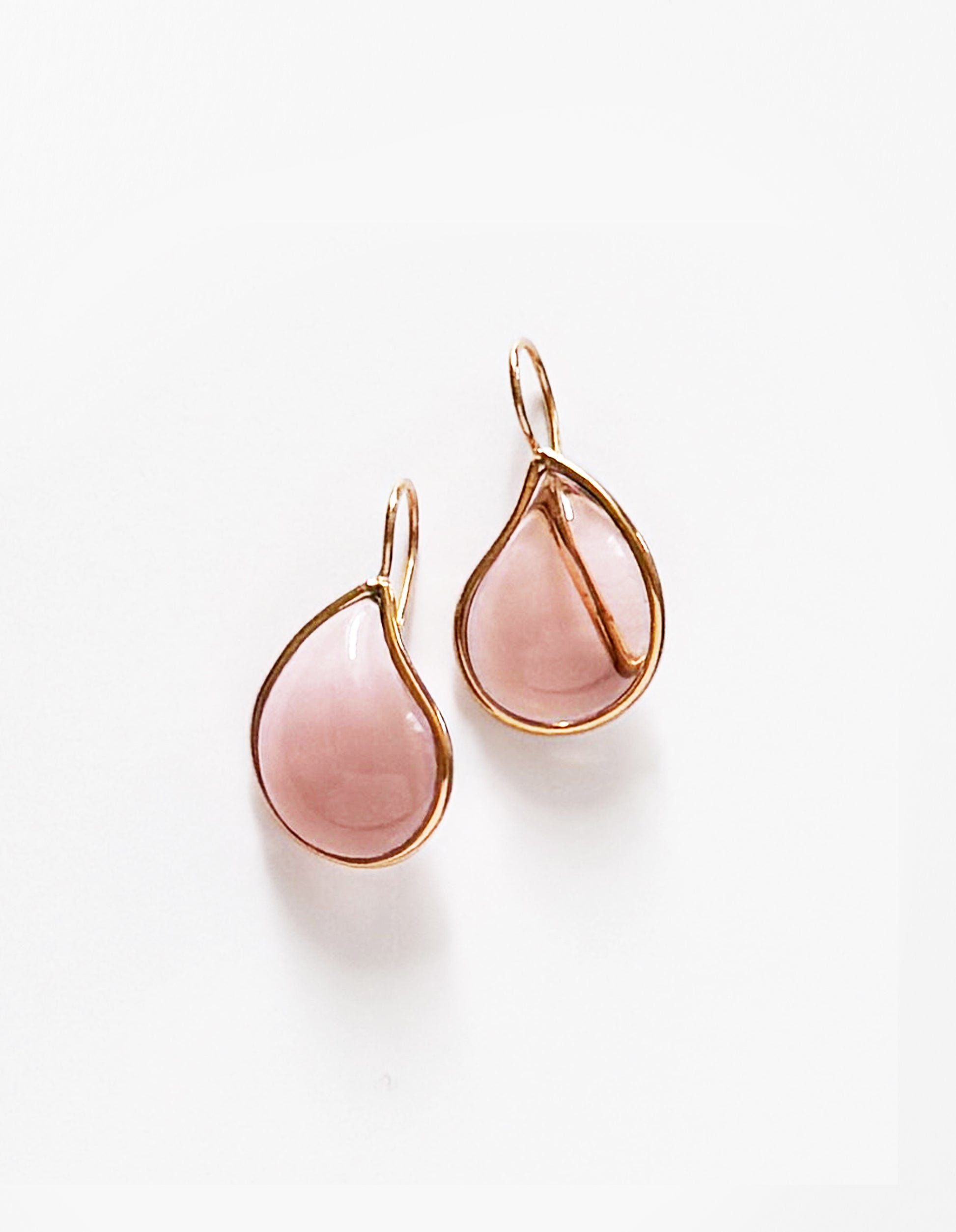 Ces boucles d’oreilles de couleur Pêche ont la forme de Larmes. En plaqué or 24K et pâte de verre, elles sont faites à la main à Paris.