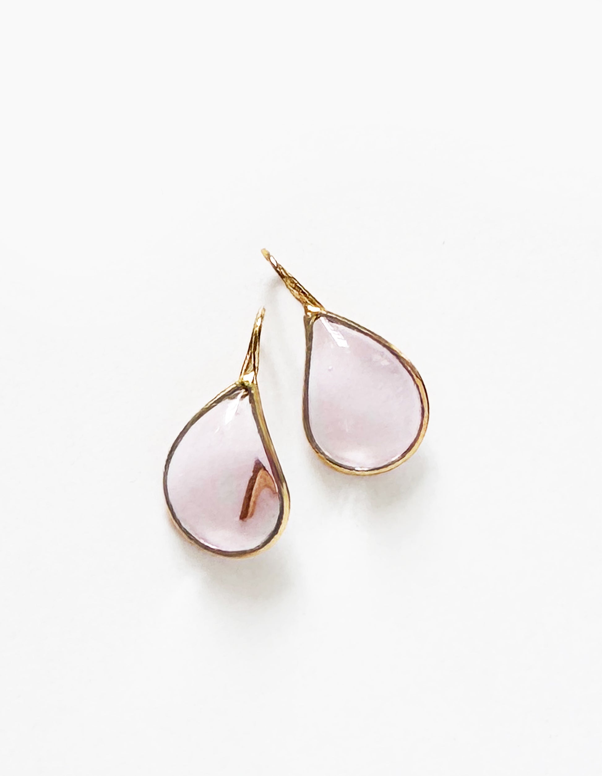 Ces boucles d’oreilles de couleur poudre ont la forme de Larmes. En plaqué or 24K et pâte de verre, elles sont faites à la main à Paris.