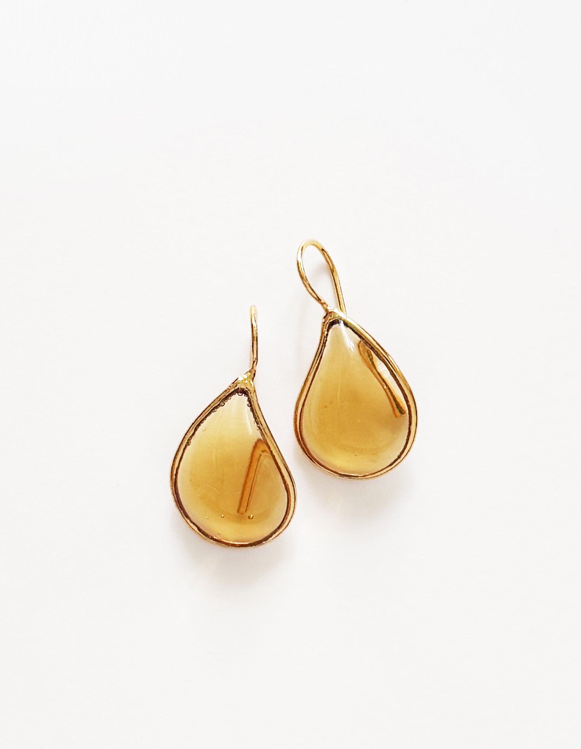 Ces boucles d’oreilles de couleur Tournesol ont la forme de Larmes. En plaqué or 24K et pâte de verre, elles sont faites à la main à Paris.