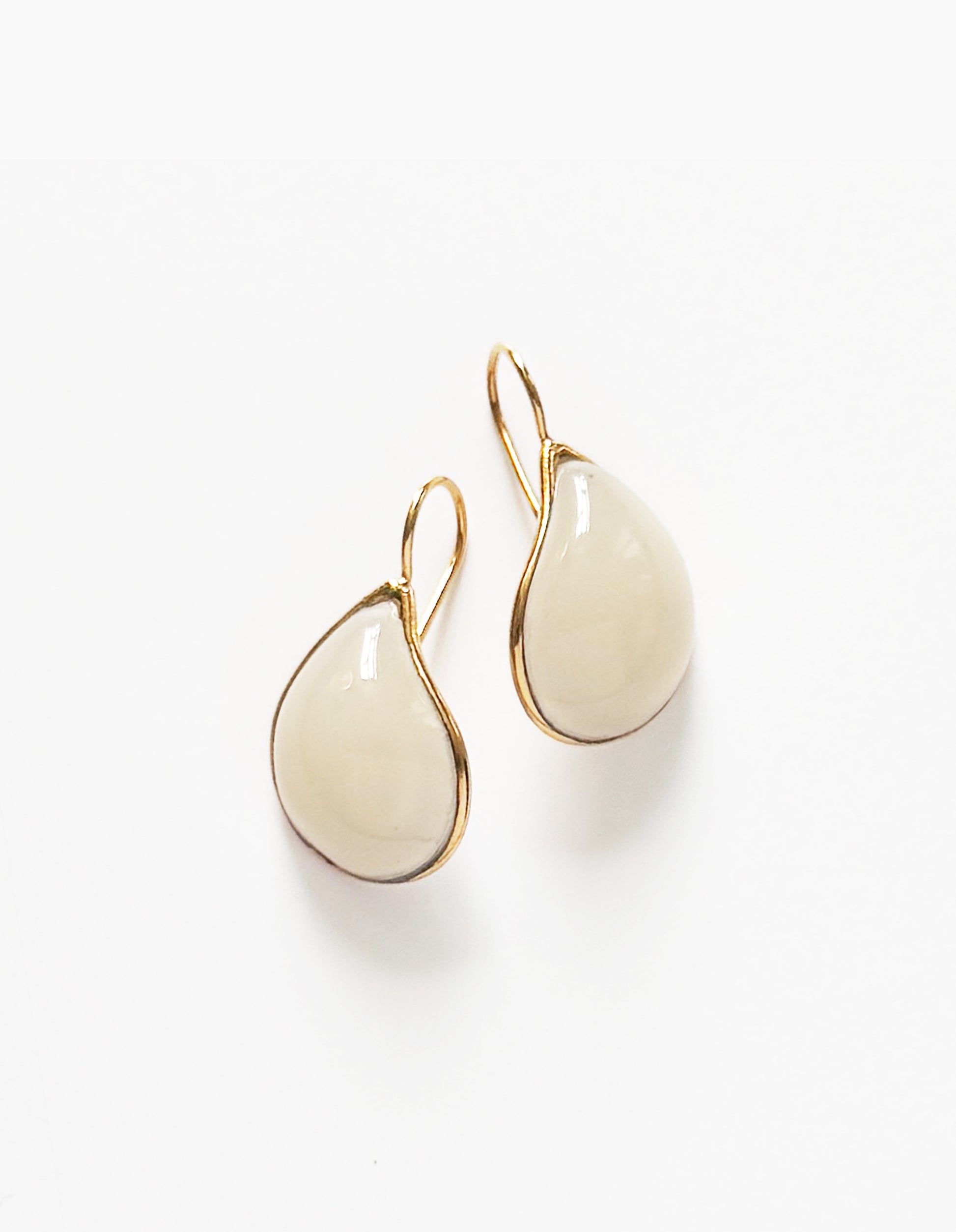 Ces boucles d’oreilles de couleur vanille ont la forme de Larmes. En plaqué or 24K et pâte de verre, elles sont faites à la main à Paris.