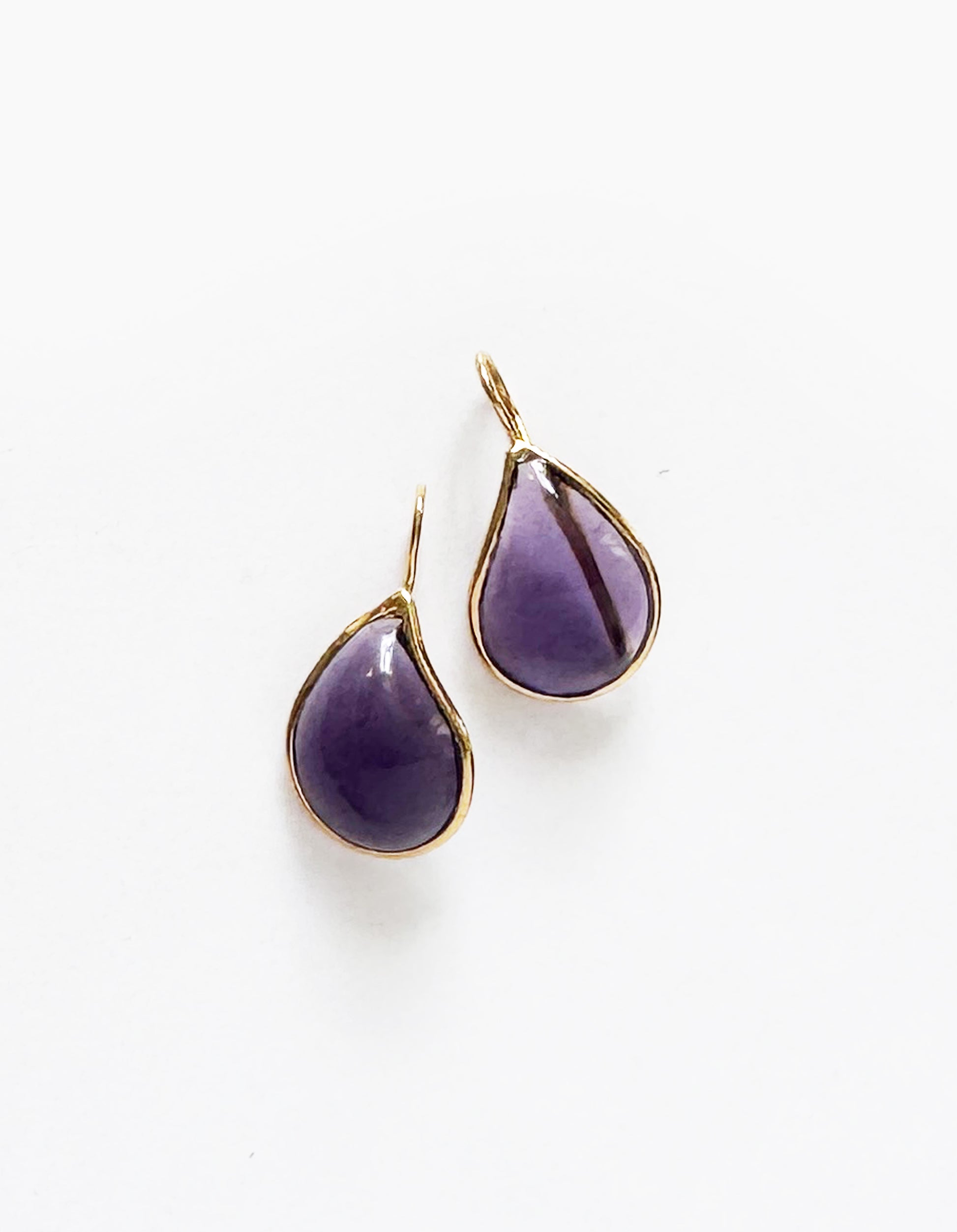 Ces boucles d’oreilles de couleur Violette ont la forme de Larmes. En plaqué or 24K et pâte de verre, elles sont faites à la main à Paris.